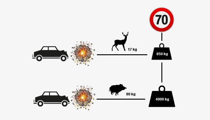 Ali ste vedeli, da če vozite s hitrostjo 70 km/h in trčite v žival težko 17 kg, je naletna teža živali z vozilom 850 kg, medtem ko je pri trku z živaljo težko 80 kg naletna teža z vozilom 4000 kg?